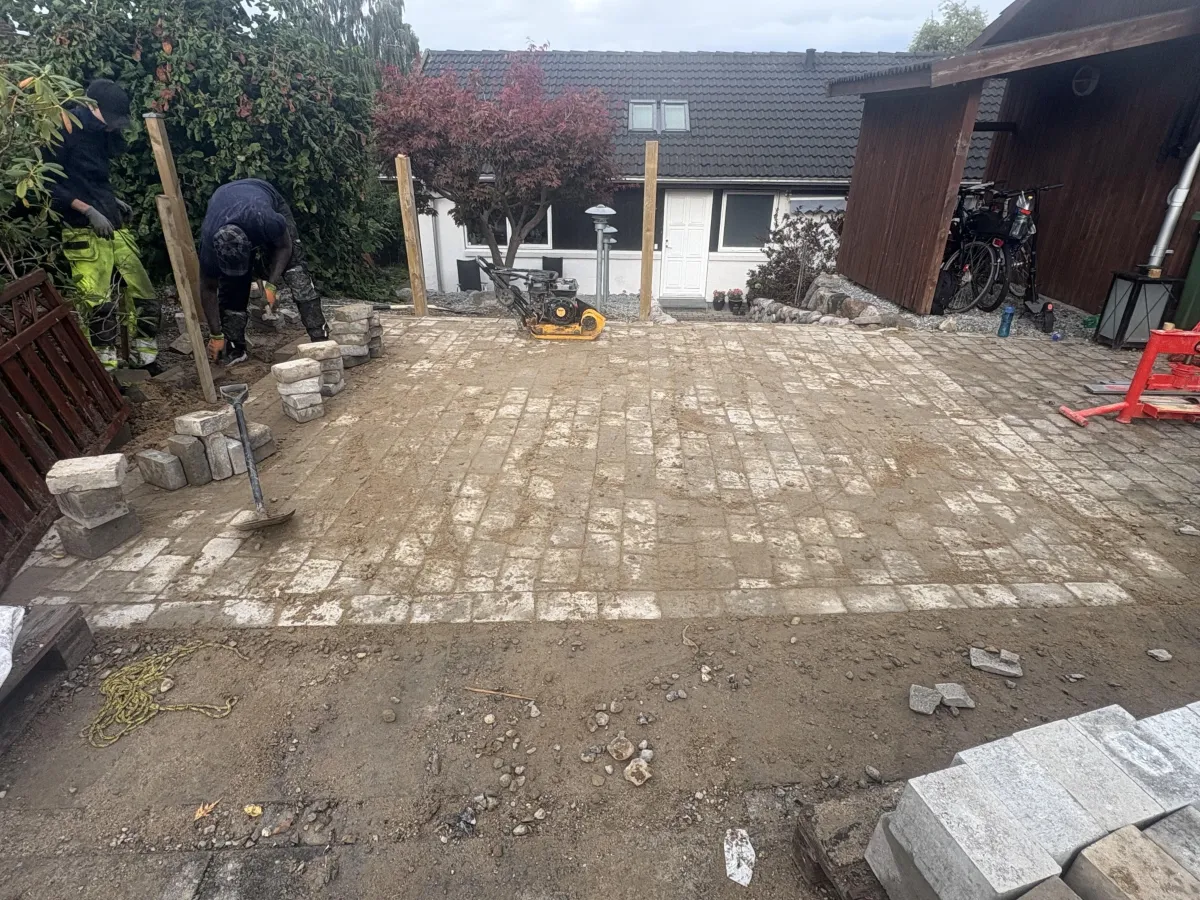 Ekspertanlæg af terrasser, stier, indkørsler og parkeringspladser med fliser, brosten eller beton.